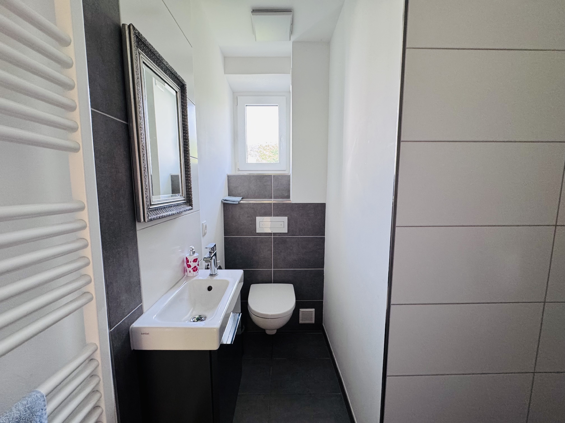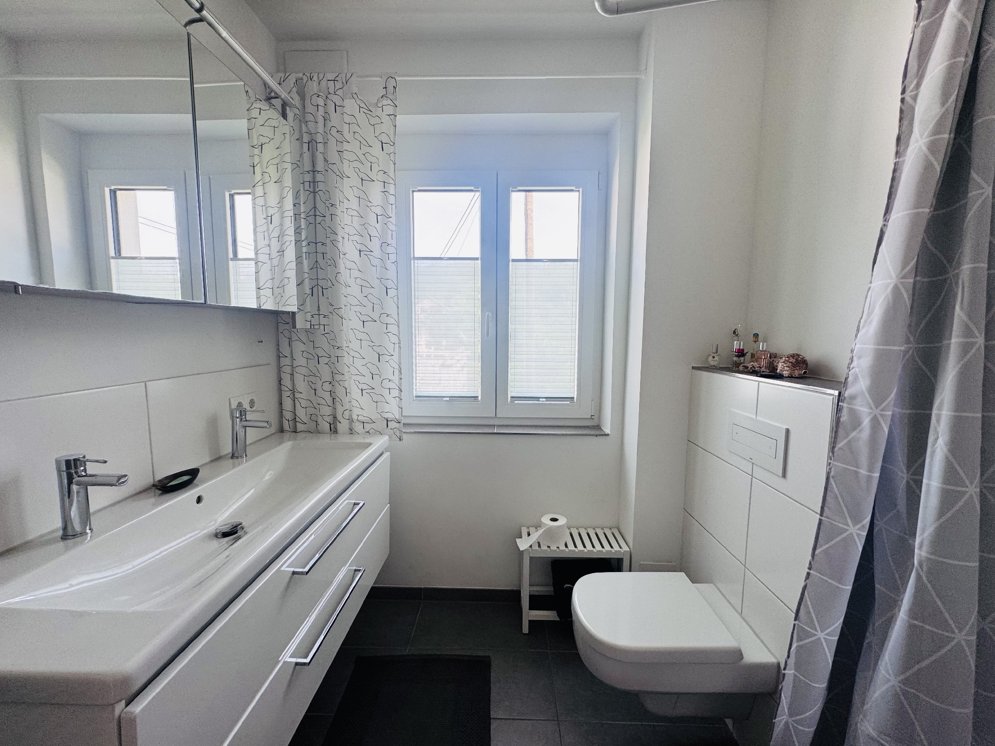 Bad mit Dusche, WC, Waschbecken und Fenster