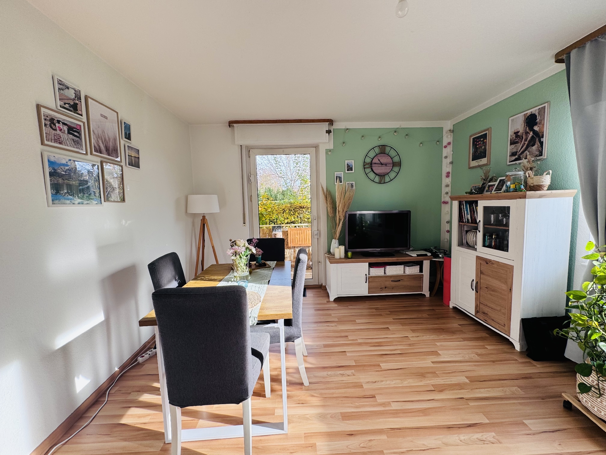 Über die zentrale Diele mit praktischem Abstellraum erreicht man alle Räume der Wohnung. Das helle Wohnzimmer ist nach Süden ausgerichtet und beeindruckt durch große Fensterflächen, die viel Tageslicht hereinlassen. Von hier aus gelangt man auf den sonnigen Balkon und die hübsche Terrasse, die zum Entspannen im Freien einlädt.
